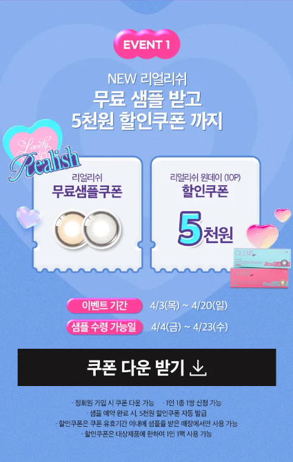 컬러 렌즈를 착용해 보고 싶지만 망설였던 분들, 혹은 자연스럽고 또렷한 눈빛을 연출하고 싶은 분들에게 희소식! 오렌즈에서 인기 컬러 렌즈 **‘리얼리쉬(Realish)’**를 무료로 체험할 수 있는 특별한 이벤트를 진행합니다.